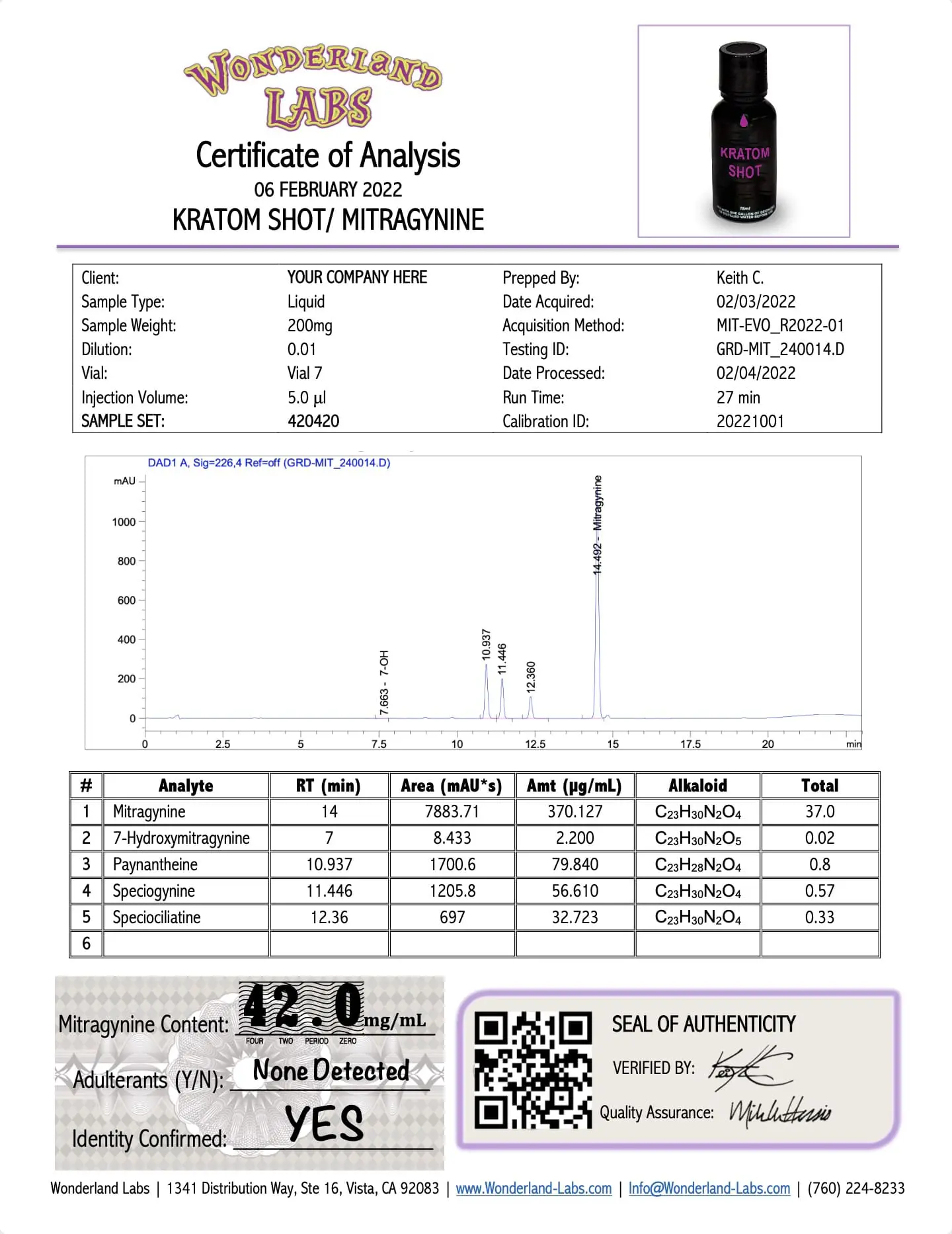 One of the main reasons clients come to us is to end up with a Certificate of Analysis for their products. A Certificate of Analysis accomplishes several things; it provides you and your clients/customers with verification of the identity of your material or product, immediately increasing trust in your brand. It also shows the amount of key components of your material. For example, the Kavalactone percentage and the Kavalactone Lineup are key aspects of any Kava product. The Certificate of Analysis contains that key information.